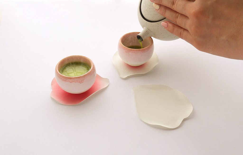 日本らしいサプライズを見ることができるコースター。 暖かい飲み物を注いだコップを花びらの形をしたコースターにおけば暖色に染まり、生命力を感 じる。それはさらに歓迎されているようにも見え、思わず私たちは笑顔になるでしょう。花びら の形は日本らしいイメージのある椿を選んだ。実際の花びらのようにやわらかな触感の紙に温感 変色インクを印刷することで実現する。